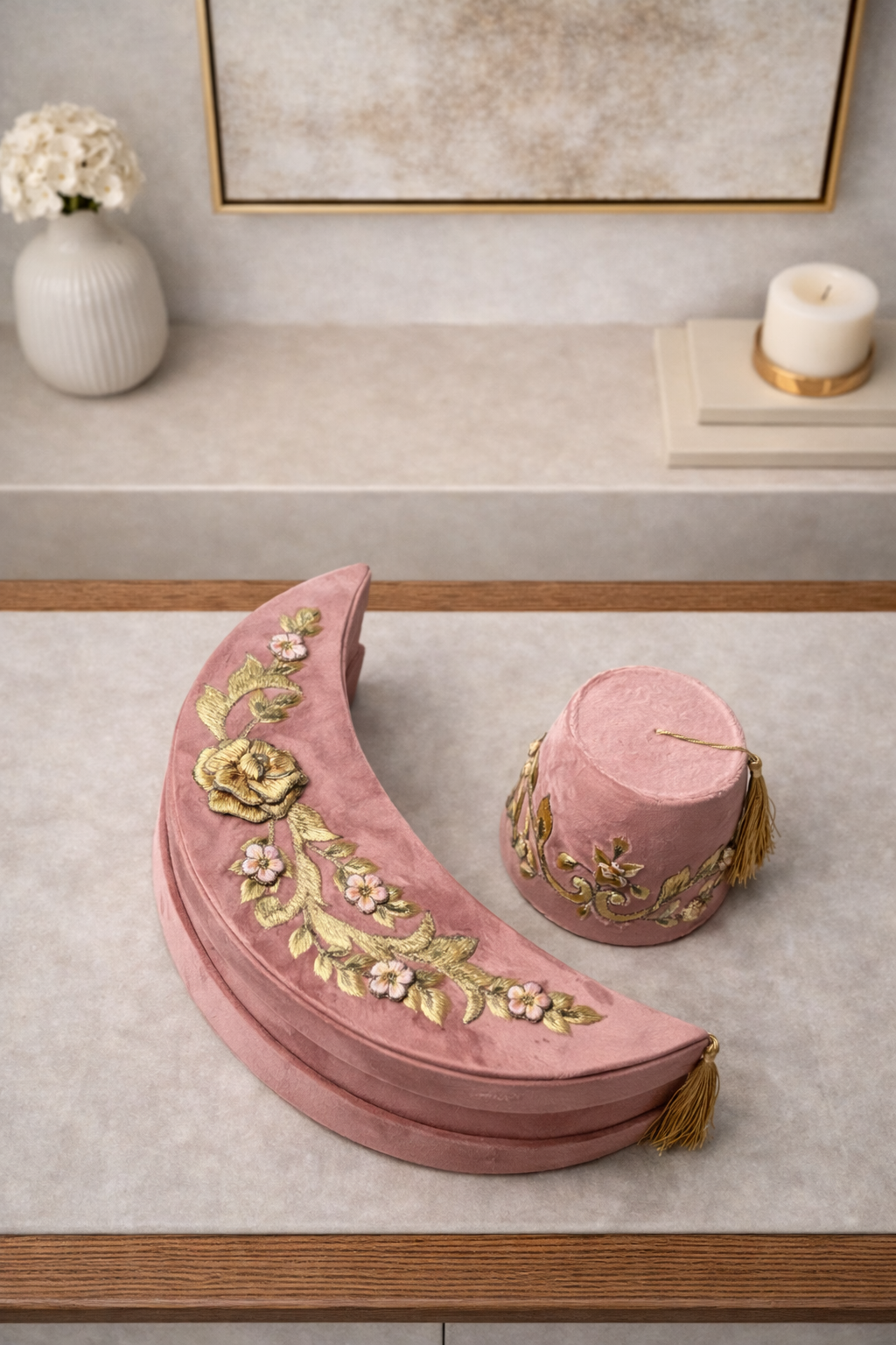 Be the first to review “طقم علب فاخرة من قطعتين على شكل هلال وطربوش من المخمل المطرز لون زهري”