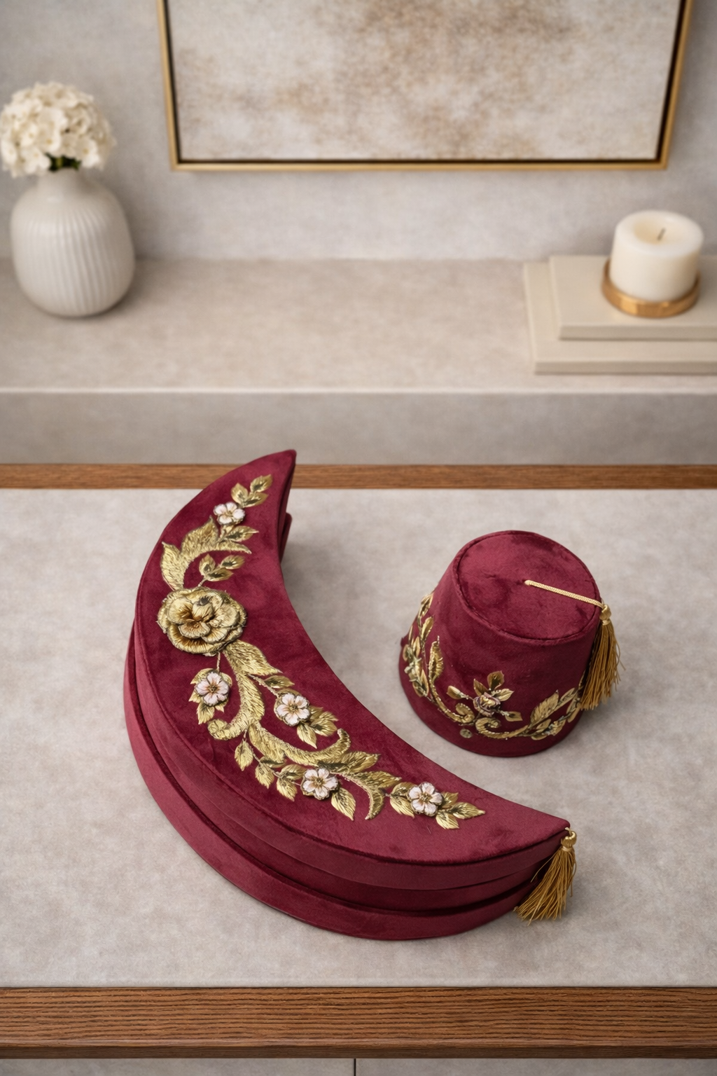 Be the first to review “طقم علب فاخرة من قطعتين على شكل هلال وطربوش من المخمل المطرز لون خمري”