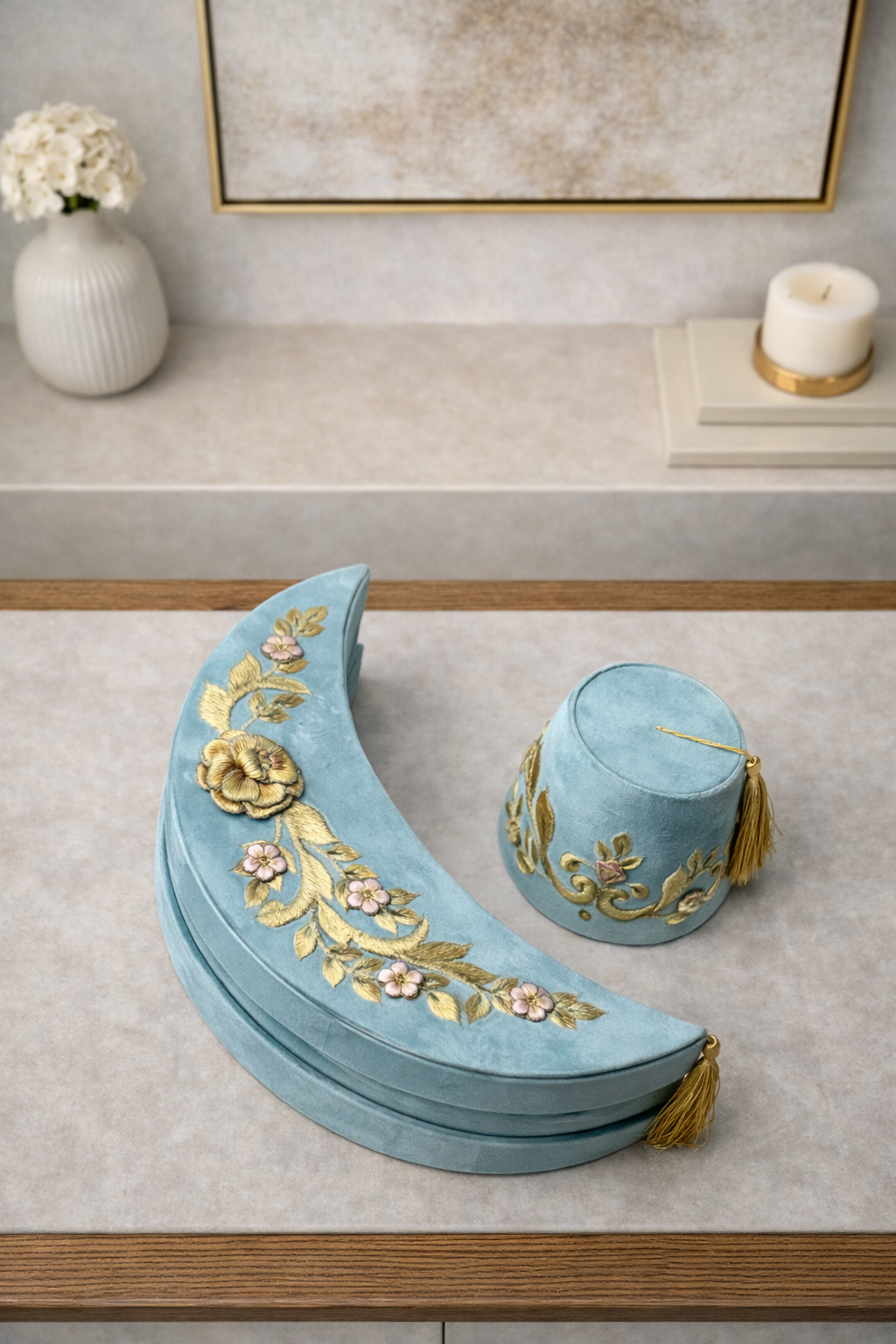 Be the first to review “طقم علب فاخرة من قطعتين على شكل هلال وطربوش من المخمل المطرز لون تيفاني”